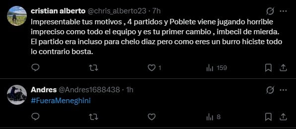La respuesta de Meneghini no pasó inadvertida entre los hinchas, quienes se mostraron indignados en redes sociales e incluso volvieron a pedir la salida del DT.