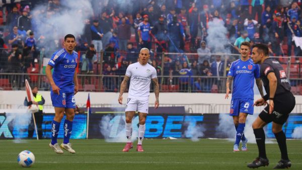Durante el primer tiempo del partido ante Audax Italiano, barristas hicieron estallar bombas de estruendo, muy cerca del arco del portero Gabriel Castellón.