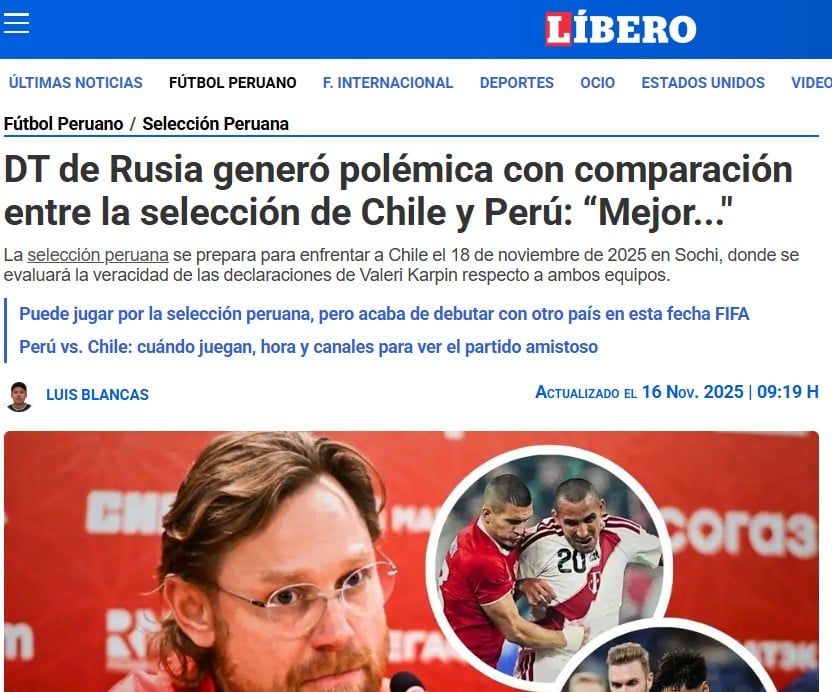 Esto no cayó nada de bien en Perú, donde el medio Líbero tituló: "DT de Rusia generó polémica con comparación entre la selección de Chile y Perú".