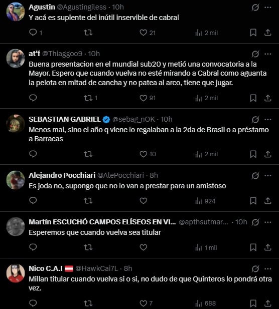Ante esto, el DT decidió nominar al joven mediocampista de Independiente y uno de los pocos rendimientos destacados de Chile en el torneo mundial, lo cual fue celebrado por los hinchas del "Rojo" en redes sociales, quienes incluso lo postularon para ser titular en el elenco argentino por sobre Luciano Cabral.