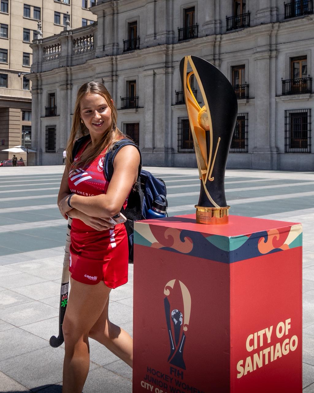 Hope Haynes es parte del equipo estadounidense de hockey césped que disputa la Copa Mundial Femenina Junior Santiago 2025 en el Centro Deportivo Claudia Schüler del Estadio Nacional y semanas atrás, participó en la sesión de fotografías realizada en el frontis del Palacio de La Moneda junto al trofeo de la cita planetaria.