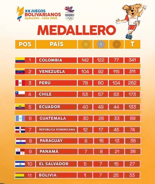 El podio quedó configurado de la siguiente manera: Colombia obtuvo el primer lugar con 142 preseas de oro, Venezuela sumó 104 y Perú alcanzó las 78 medallas doradas. La delegación chilena se posicionó inmediatamente después, demostrando un avance significativo en la región.