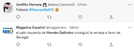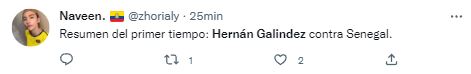 Ante esto, los hinchas ecuatorianos se volcaron a Twitter para comentar lo ocurrido durante los primeros 45 minutos, donde uno de los más apuntados fue el portero Hernán Galíndez.