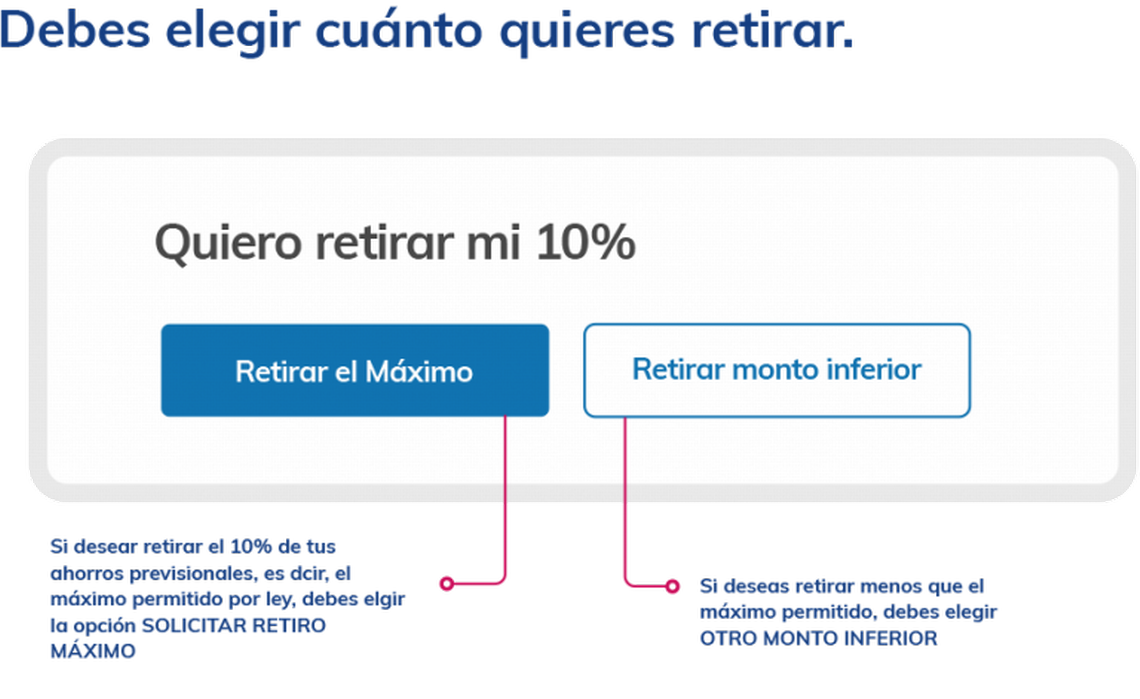 - El afiliado podrá elegir si retira el 10% de todos los ahorros que tiene, es decir, el máximo permitido por ley. Sin embargo, si alguien quiere sacar menos del máximo permitido, se debe elegir la opción "otro monto inferior"