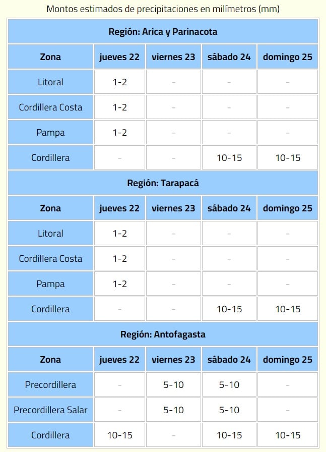 En el caso de Arica y Parinacota y Tarapacá, las lluvias afectarían sectores del litoral, cordillera de la costa, pampa y cordillera, mientras que en Antofagasta se concentrarían en la precordillera, precordillera salar y cordillera.