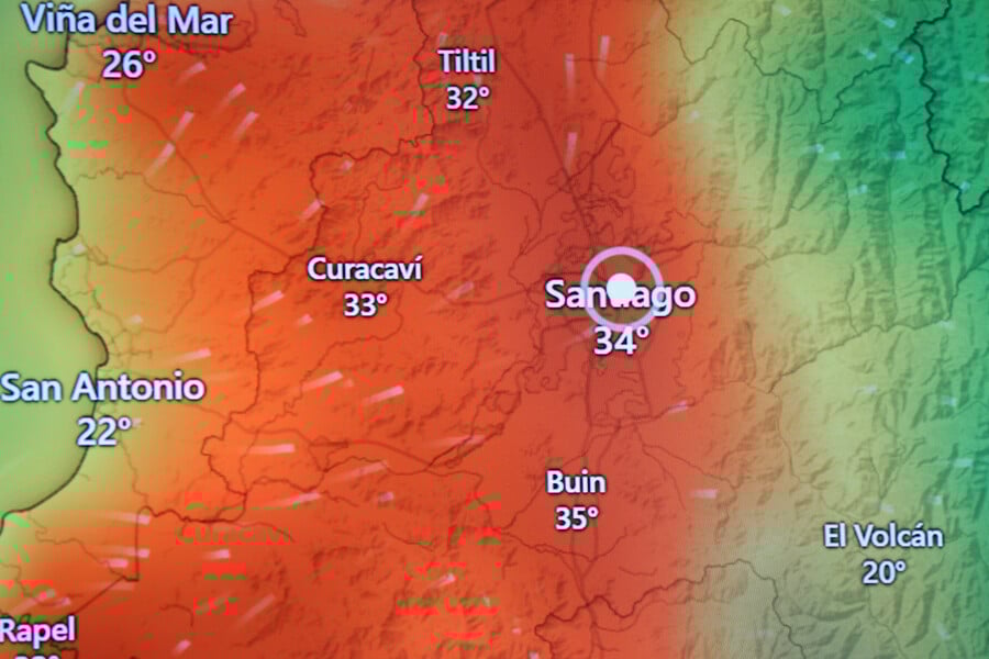 • Santiago Centro: 35° (lunes) - 35° (martes) - 35° (miércoles) - 33° (jueves)