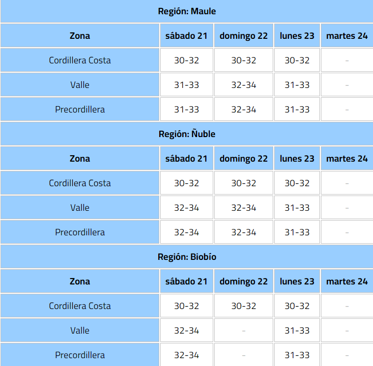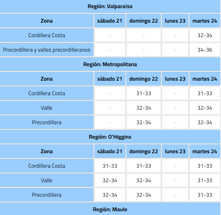 La Dirección Meteorológica de Chile extendió hasta el próximo martes 24 de febrero el aviso por altas temperaturas que se viene desarrollando en la zona central del país.