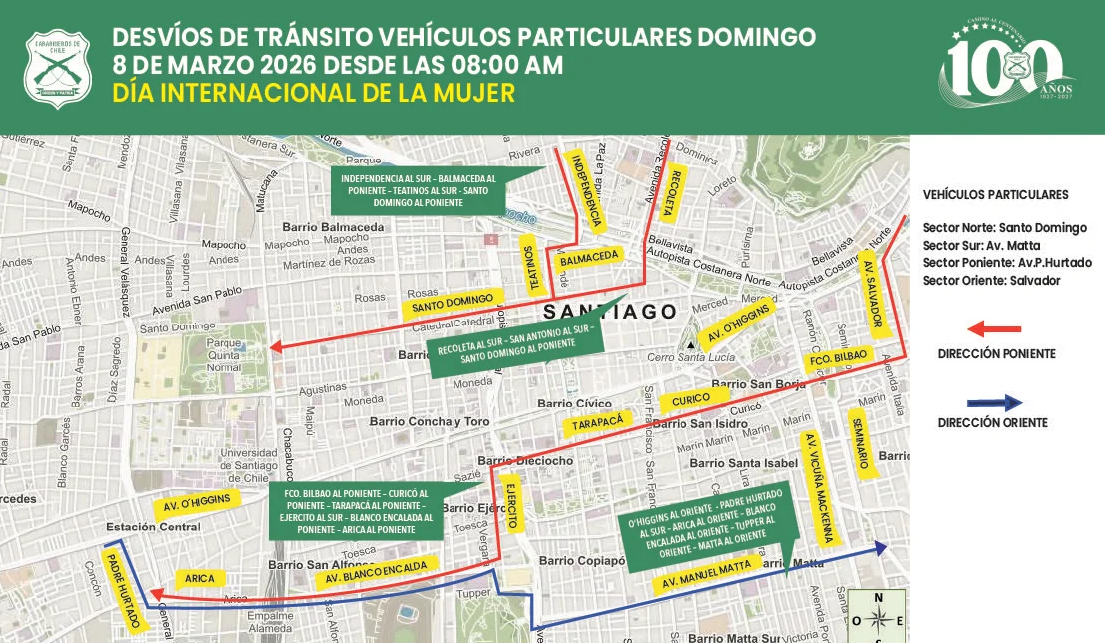 Por El transporte público y los centros de salud funcionarán bajo el esquema regular de fin de semana. Sin embargo, para esta jornada, y debido a la proyección de una alta presencia femenina, particularmente en la región Metropolitana, es que desde Carabineros informaron la implementación de diversos desvíos de tránsito en la capital.
