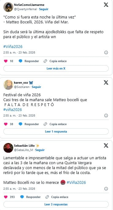 Diversas imágenes que circularon en redes sociales mostraron sectores del recinto prácticamente vacíos. Mientras algunos usuarios destacaron la calidad vocal de Bocelli, otros cuestionaron el horario en que salió a escena, apuntado en contra de la organización del festival.