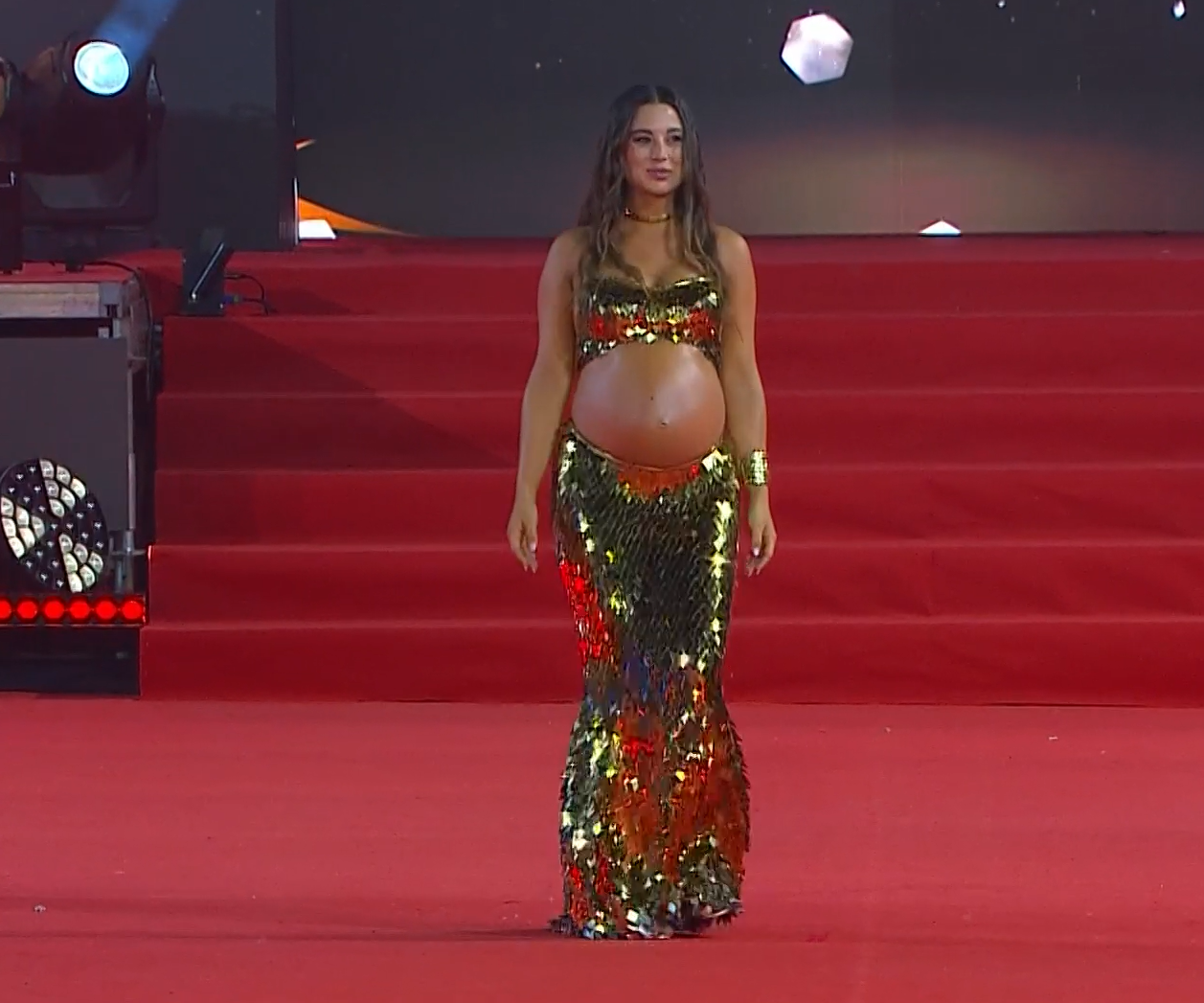 Con un traje de dos piezas de lentejuelas y dorado, mostrando su guatita, la deportista brilló mientras recorría el Sporting Club de Viña del Mar.