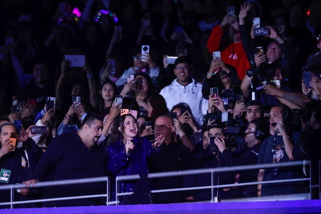 Sin embargo, la entrada de Joy se robó las miradas y desató la euforía puesto que emergió desde la galería, espacio donde saludó a sus fanáticos mientras caminaba escoltada por personal de la organización y guardias de seguridad al escenario.
