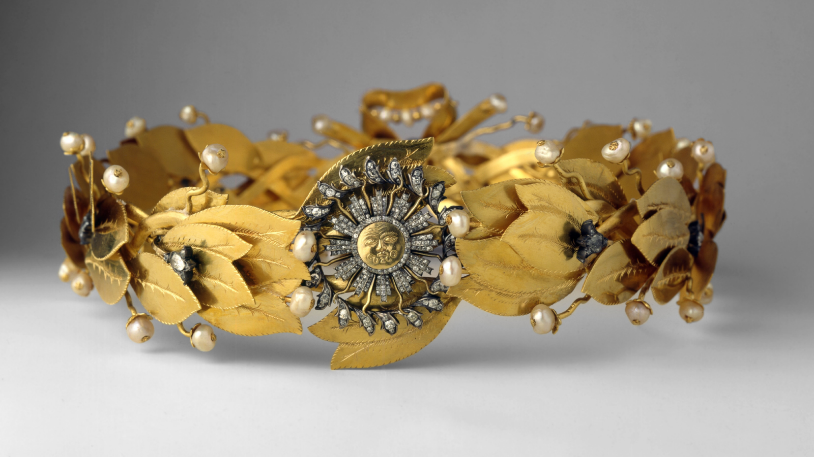 Elaborada con 47 hojas de laurel en oro, 49 perlas barrocas, 9 diamantes grandes y 274 chispas de diamantes, la llamada guirnalda cívica es considerada como una “espléndida joya” que bien parece hecha para adornar la cabeza de Napoleón o Julio César.