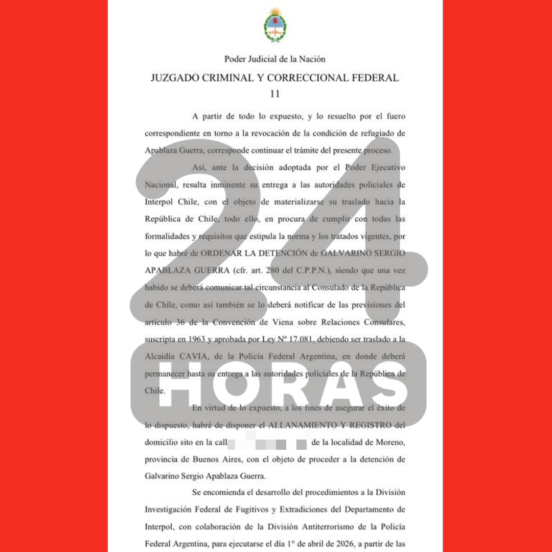 24 Horas accedió al documento del Poder Judicial de Argentina que dio cuenta de cómo fue ejecutada la orden de detención contra Galavarino Apablaza, con el fin de ser extraditado a Chile, hecho que no se pudo concretar porque el exlíder del Frente Patriótico Manuel Rodríguez no fue ubicado.