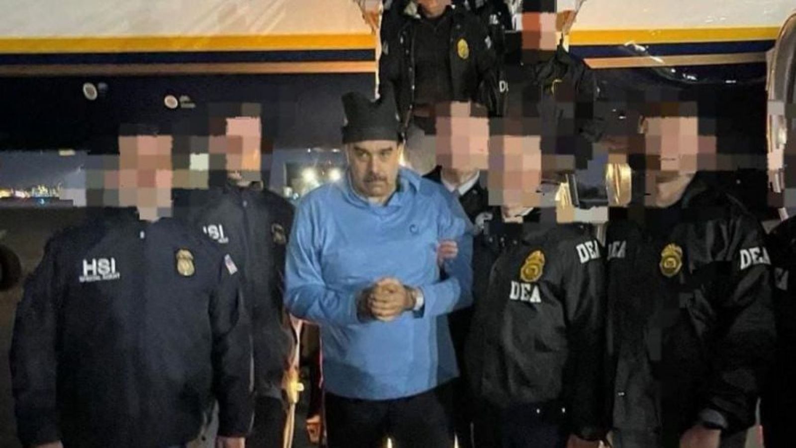 La Casa Blanca publicó imágenes de su arresto y traslado, donde se ve a Maduro caminando por un pasillo con una alfombra azul que lleva la inscripción 'DEA NYD'. En el video, Maduro parece desearle a alguien "Buenas noches, feliz Año Nuevo".