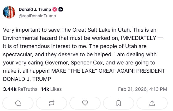 “Es muy importante salvar el Gran Lago Salado en Utah. Este es un peligro ambiental que debe abordarse INMEDIATAMENTE. Es de gran interés para mí… ¡vamos a lograrlo! ¡HAGAMOS QUE EL LAGO VUELVA A SER GRANDE!”, dijo el mandatario en un mensaje en su red Truth Social.