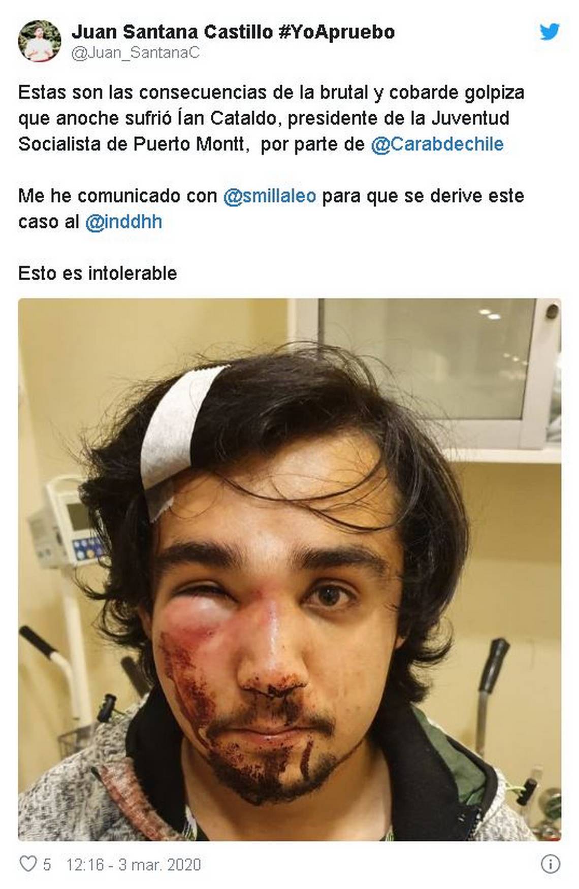 "Así dejaron ayer en Puerto Montt a este joven, presidente de la Juventud Socialista local. Acción irracional de Carabineros", afirmó Espinoza.