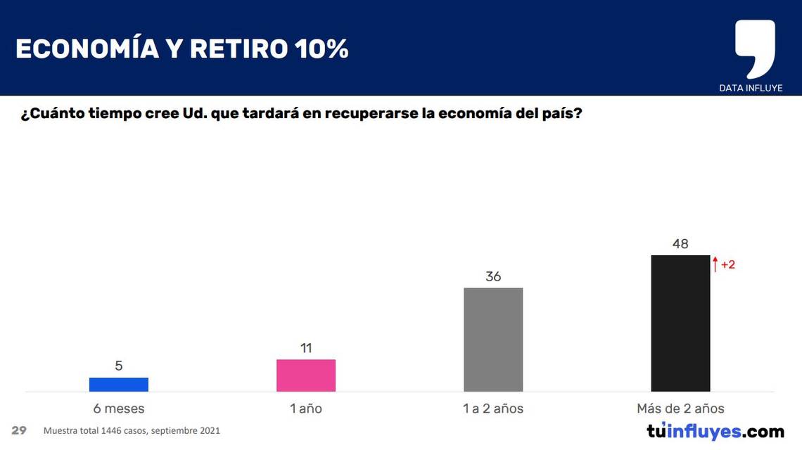 Asimismo, respecto al tiempo que podría tardar en recuperarse la economía del país, un 48% opinó que más de dos años, un 36% entre uno a dos años,11% un año, y 5% cree que seis meses.