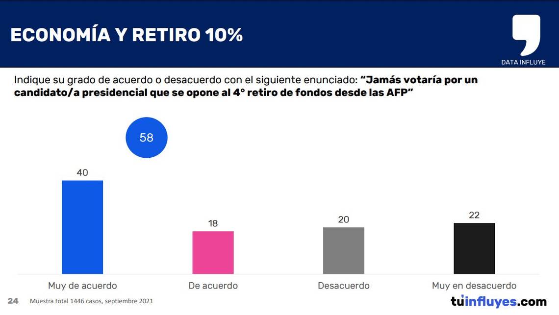 Según el sondeo, ante la consulta "Indique su grado de acuerdo o desacuerdo con el siguiente enunciado: 'Jamás votaría por un candidato/a presidencial que se opone al 4° retiro de fondos desde las AFP'", el 40% se mostró "muy de acuerdo" y un 18% "de acuerdo".
