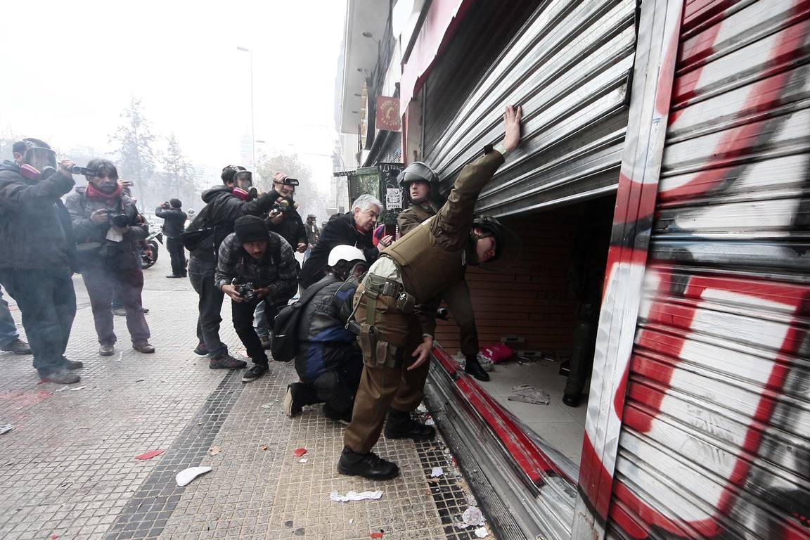 En la esquina de Manuel Rodríguez con Alameda, un grupo exaltados atacó a trabajadores de prensa con piedras y objetos contundentes.