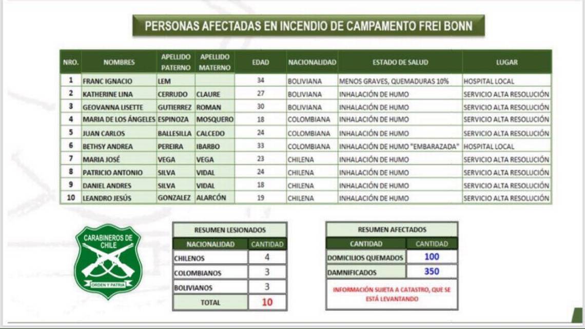 En el catastro de lesionados, del total hay cuatro chilenos, tres ciudadanos colombianos y tres bolivianos. Una de ellas estaba embarazada y se vio afectada por la inhalación de humo.