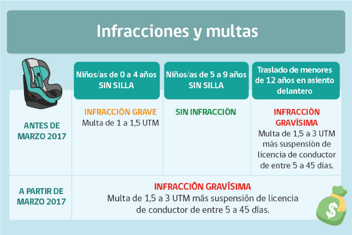 Consignar que a contar de la fecha aludida, ya sea llevar niños de 0 a 9 años sin silla o trasladar a menores de 12 años en el asiento delantero será considerado una "falta gravísima", lo cual implica la suspensión de la licencia para el conductor, entre cinco a 45 días más la multa mencionada.