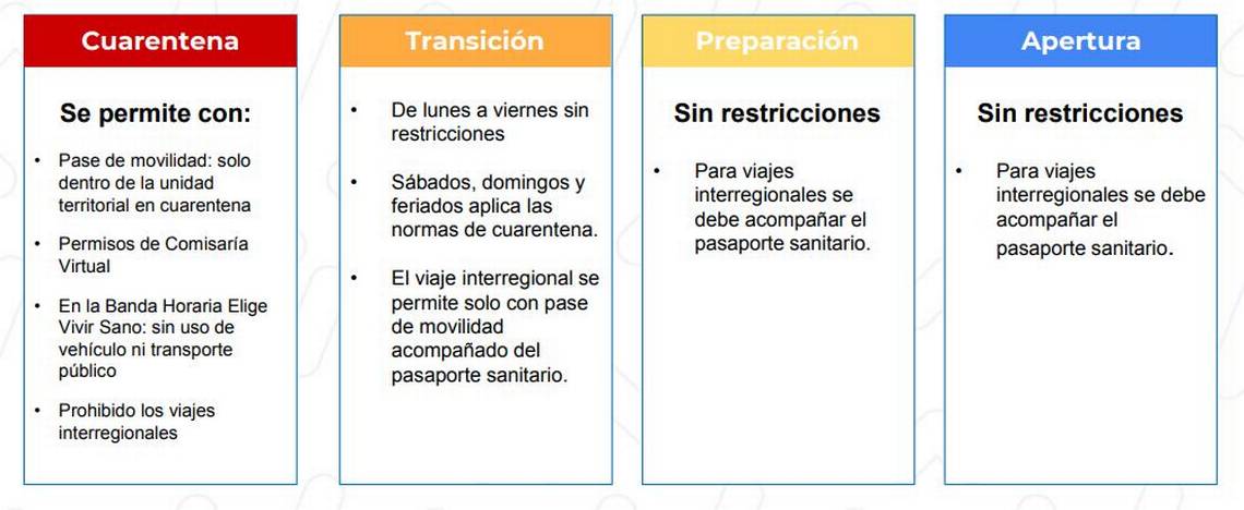 - Transición: Se permitirá la movilidad de lunes a viernes, sin restricciones. En tanto, los sábados, domingos y feriados se aplican las normas de Cuarentena. Por otro lado, se encontrará permitido el viaje interregional, solo con Pase de Movilidad, acompañado del Pasaporte Sanitario.