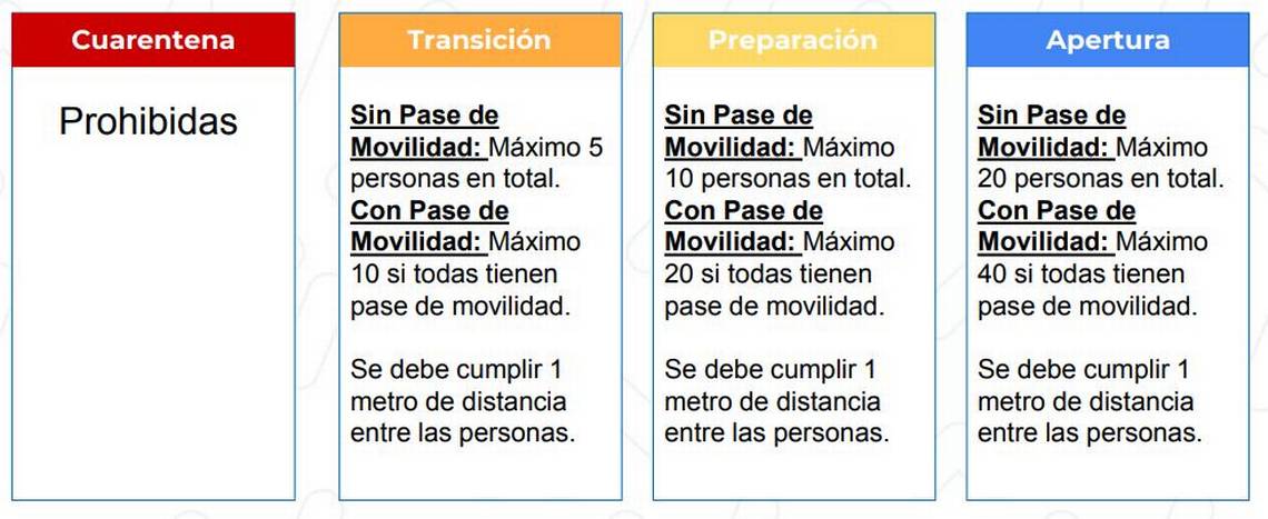 - Transición: Sin pase movilidad se permite un aforo máximo de 5 personas en total. No obstante a ello, se permitirá un aforo de 10 personas si todas tienen Pase de Movilidad. Cabe destacar que se debe cumplir con un metro de distancia entre las personas durante la reunión.