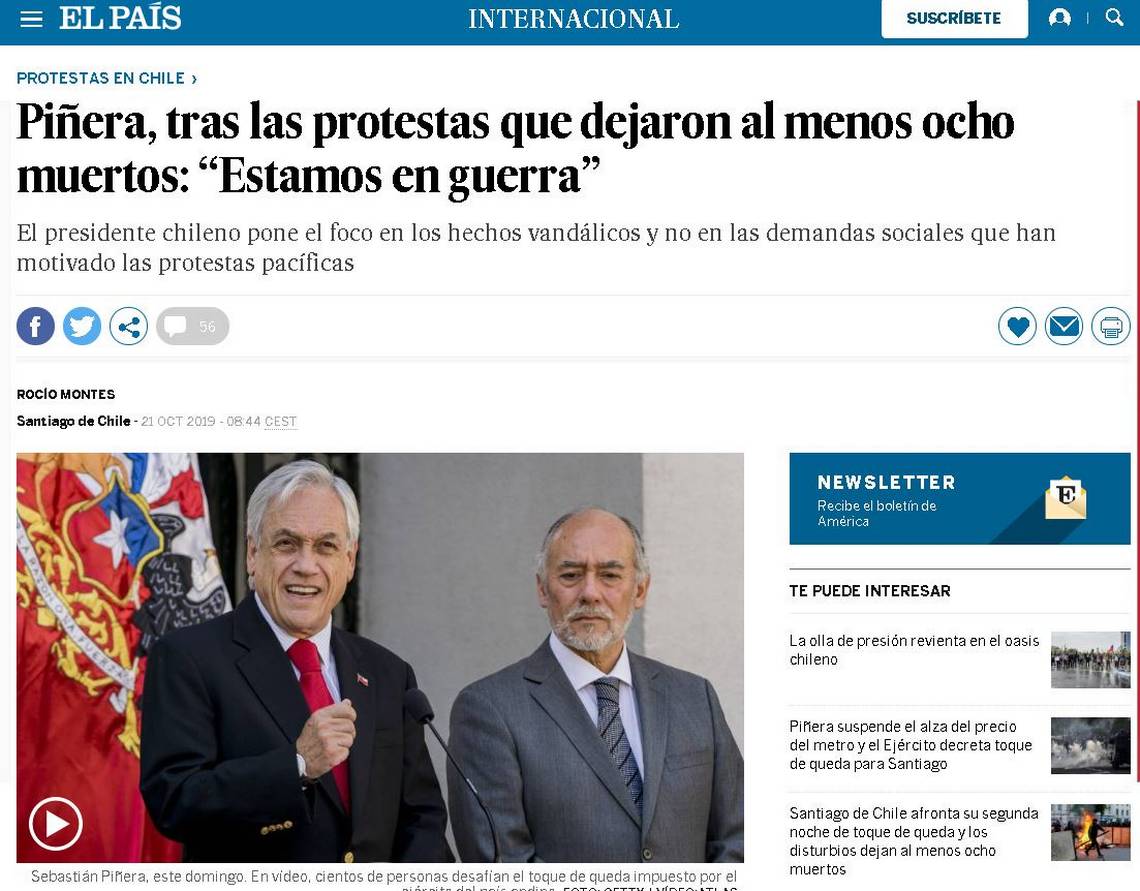 "Luego de tres jornadas de intensas protestas en diferentes lugares de Chile, que hasta ahora han dejado al menos ocho muertos, el presidente Sebastián Piñera se refirió al estado actual de su país: “Estamos en guerra contra un enemigo poderoso, que está dispuesto a usar la violencia sin ningún límite”, indicó el mandatario sobre los violentos que han destruido buena parte de la red de metro de Santiago, saqueado docenas de supermercados y locales comerciales o incendiado automotoras. Poniendo el foco en los hechos vandálicos que han marcado estas jornadas y no en las demandas sociales que han motivado en paralelo las protestas pacíficas", señalaron.