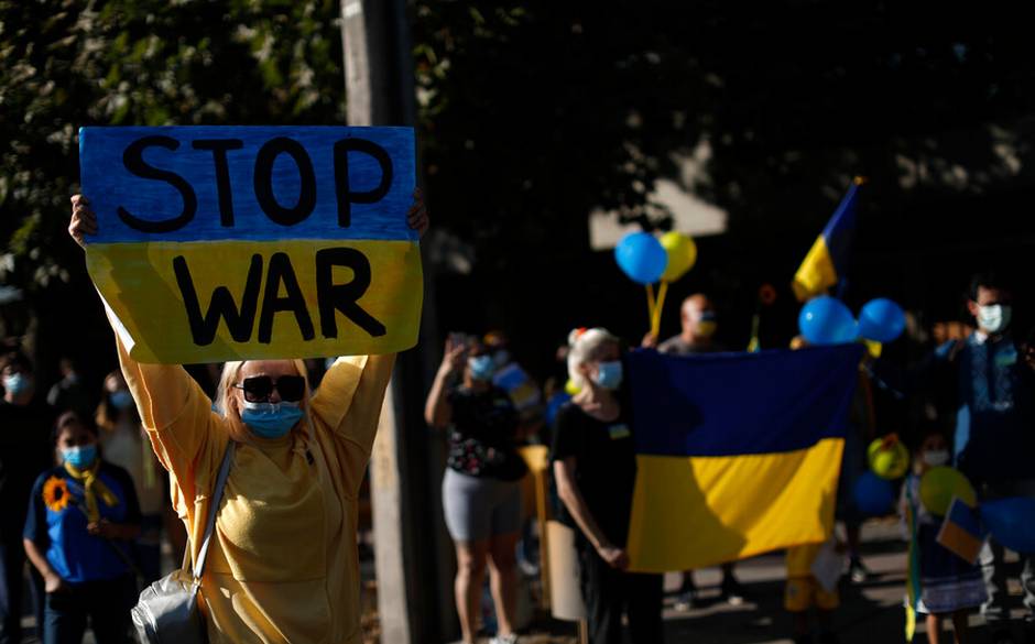 Con banderas ucranianas, globos azules y amarillos en homenaje a los colores de la bandera y carteles con mensajes en contra de la conflicto armado y a favor de la paz, entre los manifestantes había muchos ucranianos, pero también ciudadanos chilenos.