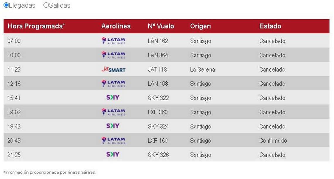 En tanto, desde el Aeropuerto de Iquique Diego Aracena se comunicó que, debido a las manifestaciones y bloqueos que se han llevado a cabo en la ciudad, se cancelaron todos los vuelos.