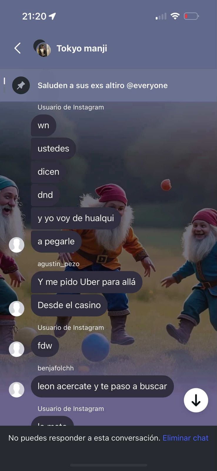 De acuerdo a lo expuesto por la Fiscalía, se estima que el grupo estaría conformado por 16 personas, quienes tenían un chat en Instagram llamado “Tokyo Manji”, haciendo referencia a una pandilla de un animé japonés, en la cual publicaban contenido violento e imágenes de sus próximas víctimas.