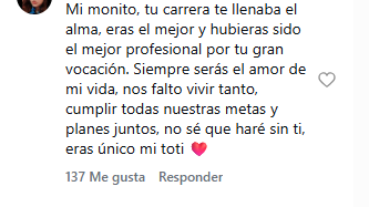 "Mi monito, tu carrera te llenaba el alma, eras el mejor y hubieras sido el mejor profesional por tu gran vocación. Siempre serás el amor de mi vida, nos faltó vivir tanto, cumplir todas nuestras metas y planes juntos, no sé qué haré sin ti, eras único mi Toti".