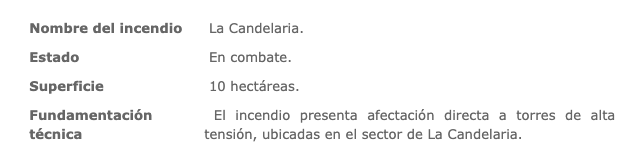 De acuerdo con la información proporcionada por la Corporación Nacional Forestal (Conaf), el siniestro afecta una superficie de 10 hectáreas y "presenta afectación directa a torres de alta tensión, ubicadas en el sector de La Candelaria".