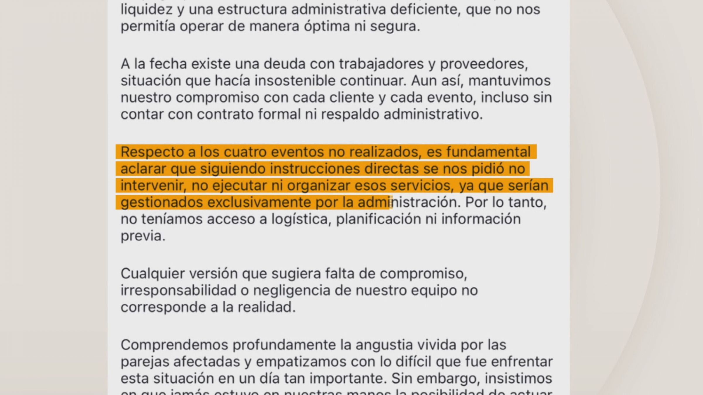 Frente a estos nuevos reclamos, la banquetera emitió una declaración en redes sociales, asegurando que, “respecto a los cuatro eventos no realizados, se nos pidió no intervenir, no ejecutar ni organizar esos servicios, ya que serían gestionados exclusivamente por la administración. Por lo tanto, no teníamos acceso a la logística, planificación ni información previa”.