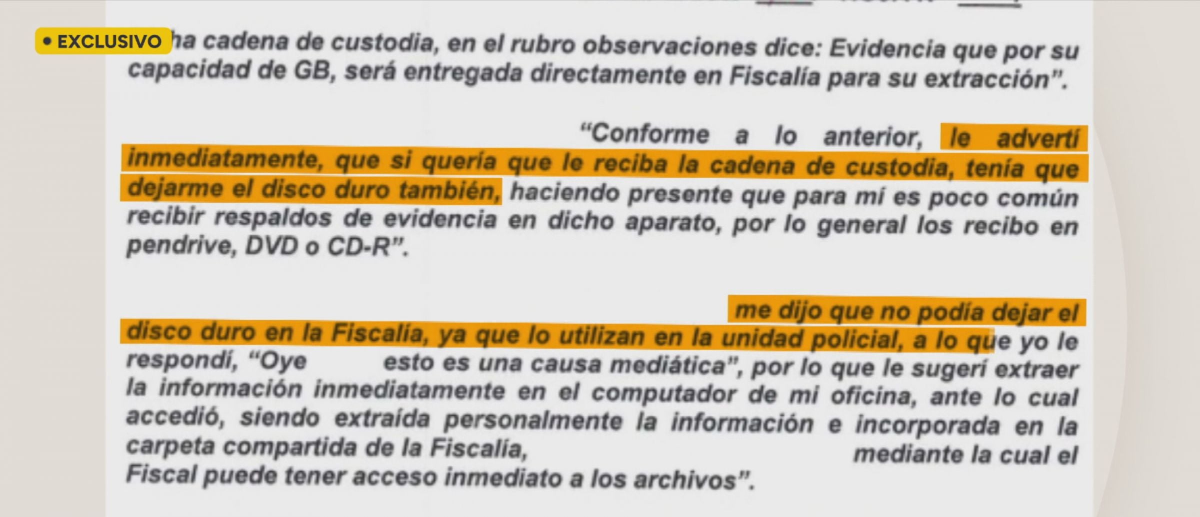 Ante esa situación, la trabajadora de la Fiscalía advirtió que no podía recepcionar el material de esa forma, considerando además la alta exposición pública del caso. Pese a ello, el funcionario se habría negado a entregar el disco duro, argumentando que era utilizado de manera permanente por su unidad.