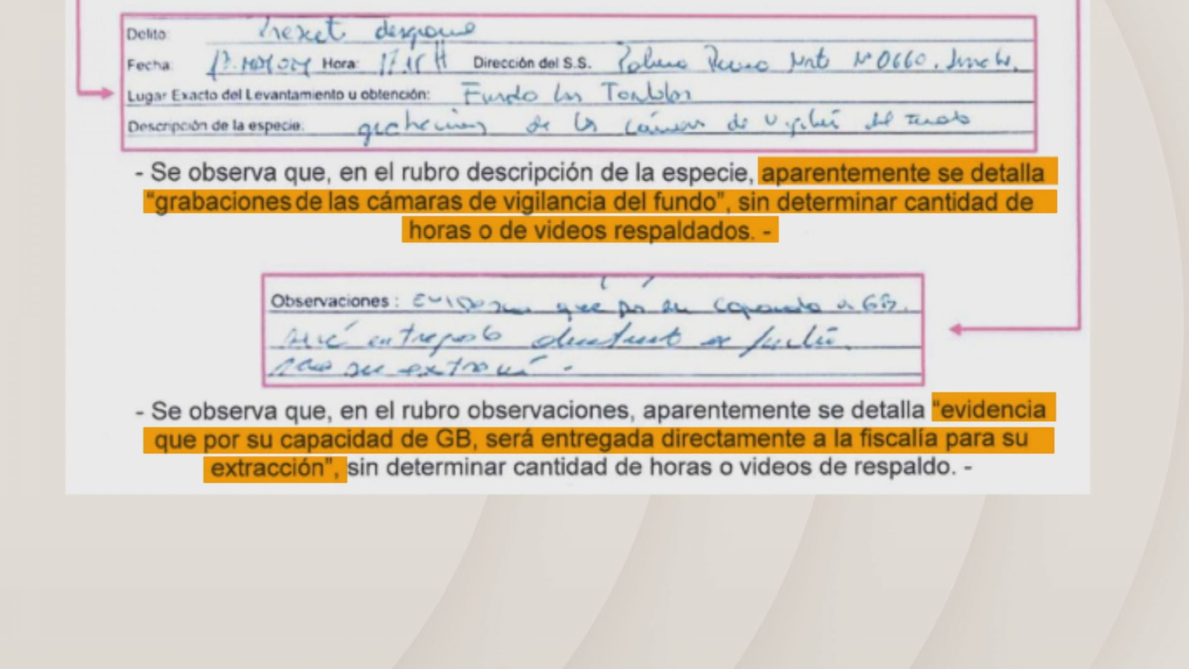 A estos antecedentes se suman los análisis técnicos realizados posteriormente. Una perito en video señaló que el material fue presentado de manera irregular y sin información clara respecto al total de horas registradas. Al revisar la cadena de custodia, se detectó que los archivos no contenían un registro continuo de 24 horas, sino solo un fragmento de aproximadamente seis horas de grabación.