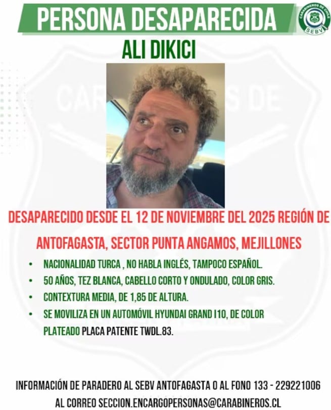 Más de un mes ha pasado desde que Ali Dikici de 50 años y de nacionalidad turca, desapareció sin dejar rastro de su paradero. La pista principal es una publicación que subió en sus redes sociales, donde se ve el auto marca Hyundai Grand de color plateado estacionado y enterrado en la arena de la Playa Hornitos. Mismo vehículo que arrendó durante su estadía por la nación chilena.