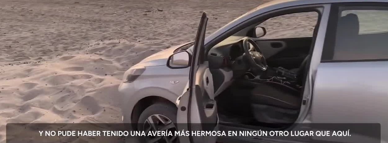 "Aquí atascado, en medio del desierto, a dos mil kilómetros de Santiago de Chile. Tengo once días para llegar allí. Y no pude haber tenido una avería más hermosa en ningún otro lugar que aquí", aseguró en el registro, donde también mostró que fue socorrido por otras personas mediante una grúa.