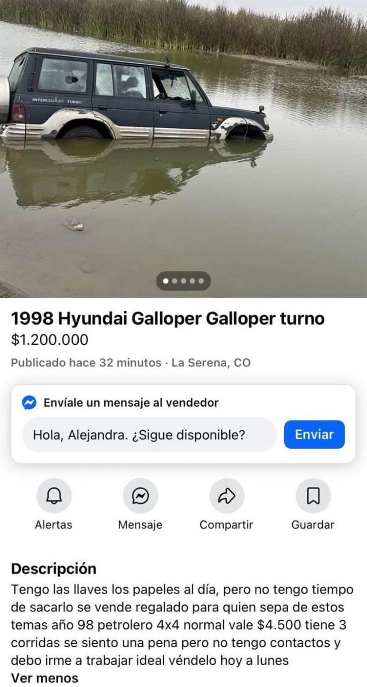 La situación escaló aún más cuando se conoció que la mujer publicó en redes sociales un aviso ofreciendo el vehículo en venta, señalando que no podía sacarlo del agua. El monto asciende a $1.200.000. El vehículo es un Hyundai Galloper de 1998, petrolero.