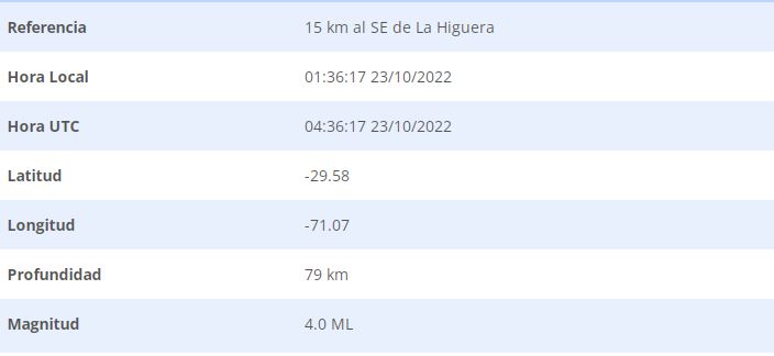 Hora Local: 2022/10/23 01:36:17, mag: 4.0, Lat: -29.58, Lon: -71.07, Prof: 78.7, Loc : 14.91 km al SE de La Higuera