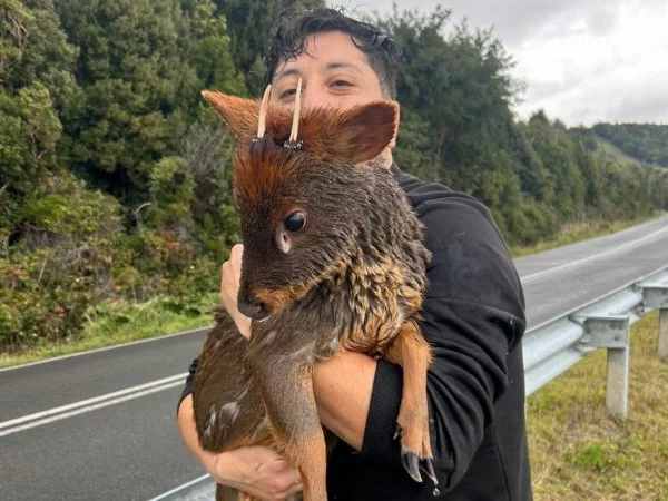 Miércoles 8 de mayo de 2024 Joven se lanza a lago en Chiloé para salvar a pudú que era atacado por perro El animal fue apodado como "Panchito" quedó con heridas y debió ser atendido por veterinarios y personal del SAG en Chiloé.