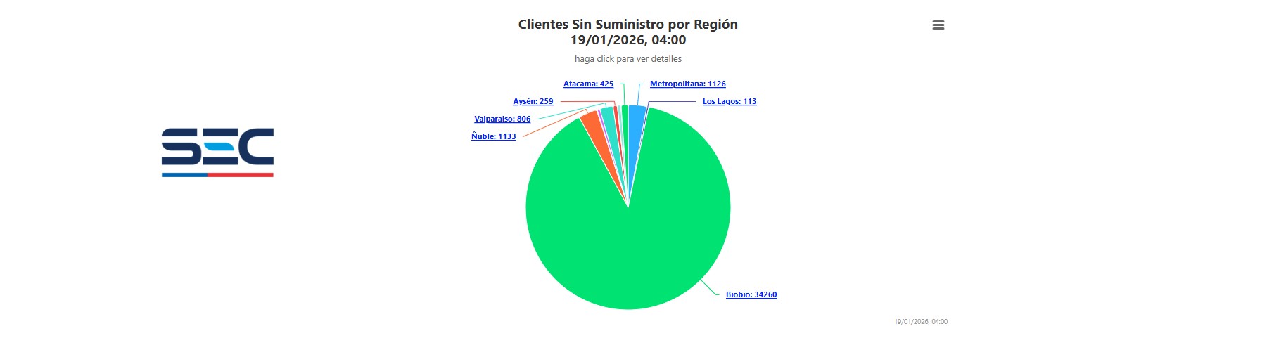 Según el último reporte de la Superintendencia de Electricidad y Combustibles (SEC) durante la madrugada de este lunes 19 de enero, la zona más afectada con el corte de suministro eléctrico es la región del Biobío, que se mantiene con Alerta Roja, donde alcanza a más de 34 mil clientes afectados