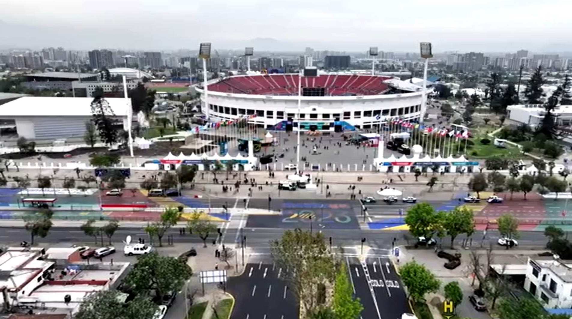 Precisamente un tramo de la Avenida Grecia, una de las principales calles para acceder al recinto de Ñuñoa, apareció pintada con los colores del megaevento deportivo y así lo captó el dron de TVN.