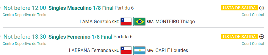 - Miércoles 25 de octubre, no antes de las 13:30: Fernanda Labraña (Chile) vs. Lourdes Carle (Argentina).