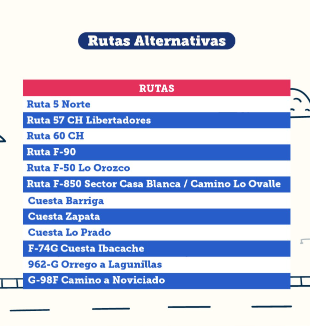 Las rutas alternativas o desvíos recomendados incluyen:
