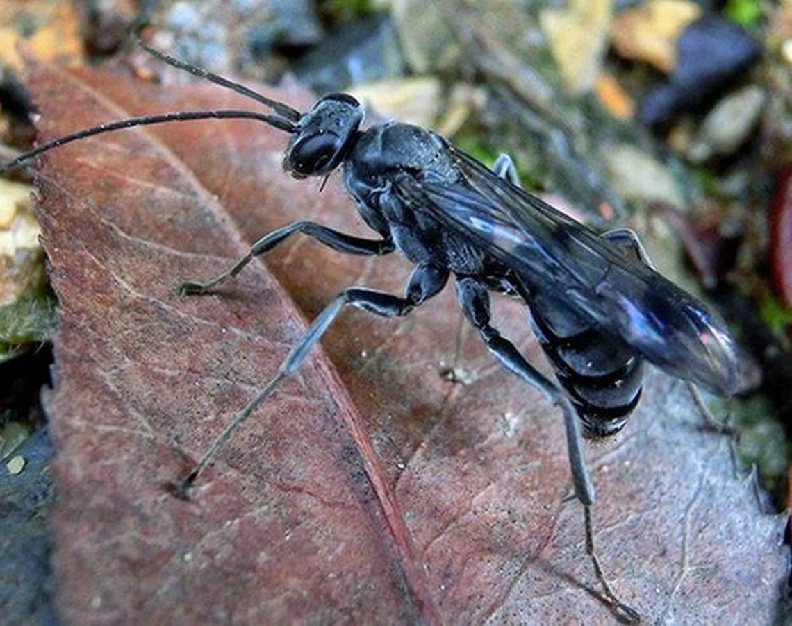 Esta avispa fue encontrada en China y construye nidos en tallos huecos que separa en varias secciones. En cada una de ellas deposita un huevo y una araña que servirá como alimento de la futura cría. La última de las celdas del nido está llena de hormigas muertas, las que crean una barrera química para prevenir la presencia de depredadores.