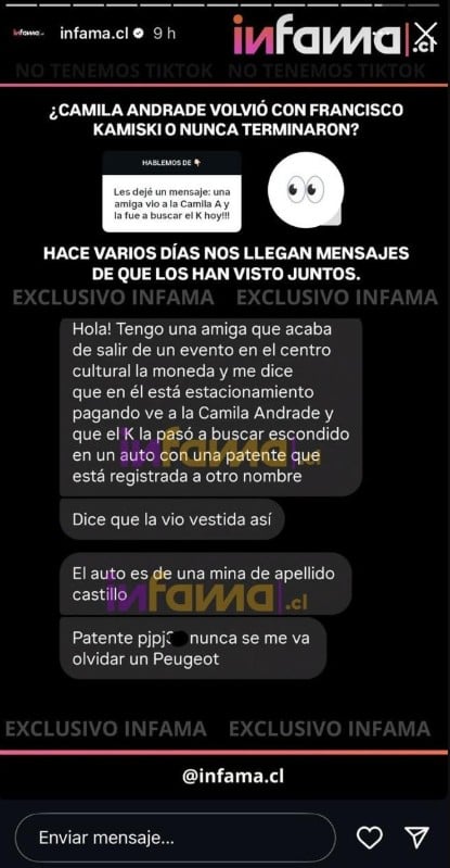 El nuevo rumor se instaló después de que la cuenta Infama, en Instagram, compartiera en sus historias el mensaje de un seguidor.