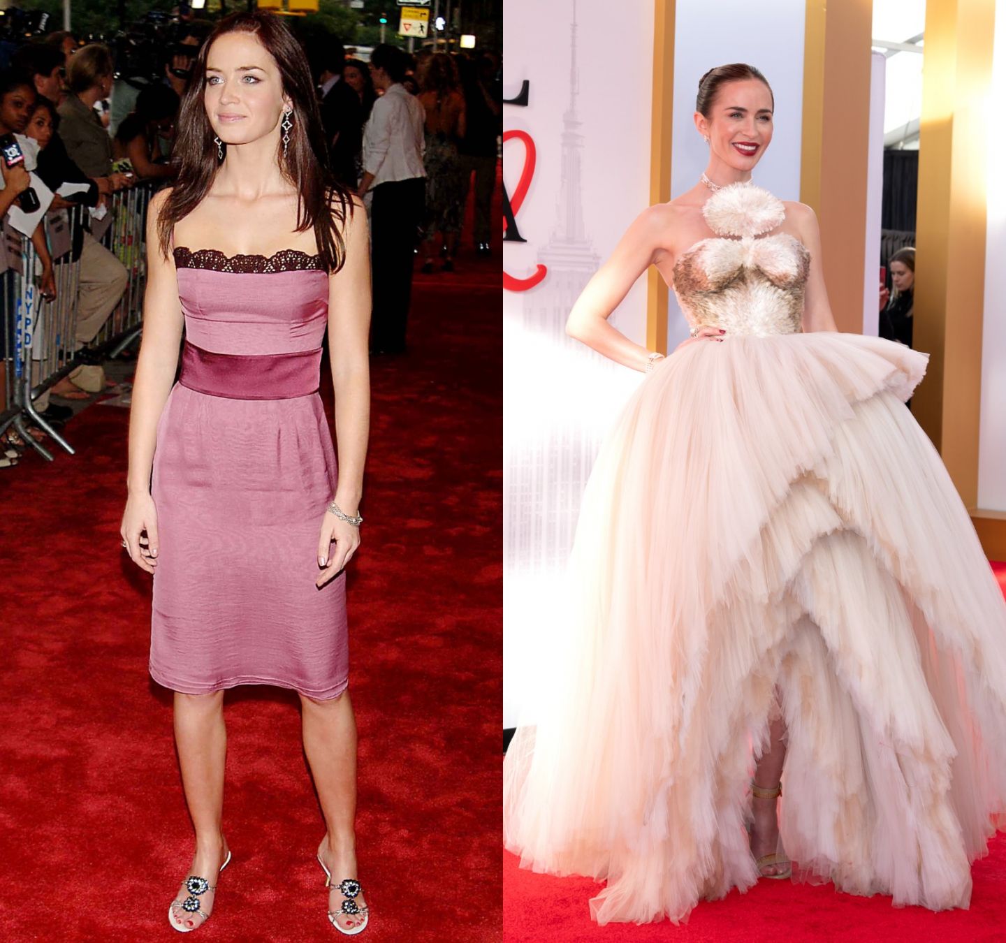 Pero la que más impactó con su look fue Emily Blunt. En 2006 vistió un vestido rosa malva de largo midi y escote cuadrado con encaje negro y tirantes, que se ajustaba a su cintura con una faja en una tonalidad más oscura, el cual acompañó con unas sandalias de tacón con tiras y flores de pedrería.