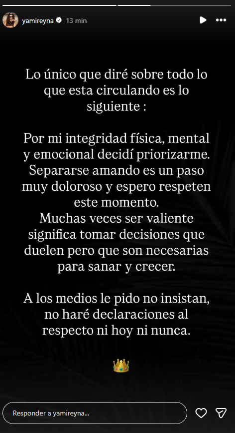 A través de una historia en su Instagram, la actriz confirmó su separación con el cantante y expresó que "por mi integridad física, mental y emocional, decidí priorizarme. Separarme amando es un paso muy doloroso y espero respeten este momento".