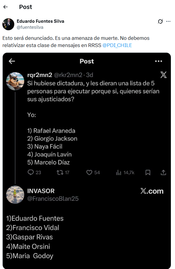 Frente a esta situación, Fuentes respondió públicamente y denuncio el hecho agregando: “Esto será denunciado. Es una amenaza de muerte. No debemos relativizar esta clase de mensajes en RRSS”, escribió, mencionando además a la cuenta de Policía de Investigaciones (PDI).